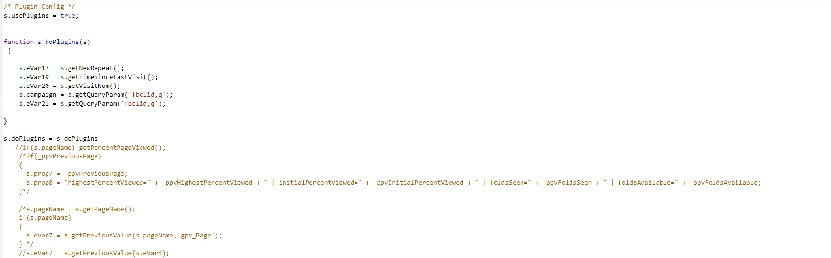 2. In Common Analytics Plugins, verify that you've enabled your 3 plugins (found in your commented code): getPercentPageViewed, getPageName, getPreviousValue.