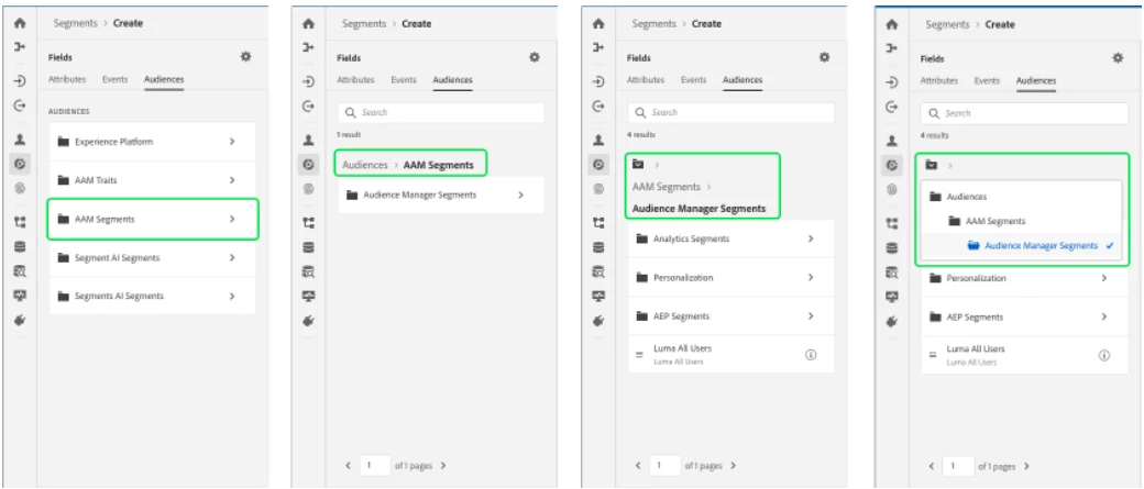 When building a segment in the Segmentation Builder UI, the Audiences tab lists all audiences created within AEP (e.g. Segments that have been built and evaluated), as well as audiences imported from external sources such as Adobe Audience Manager.