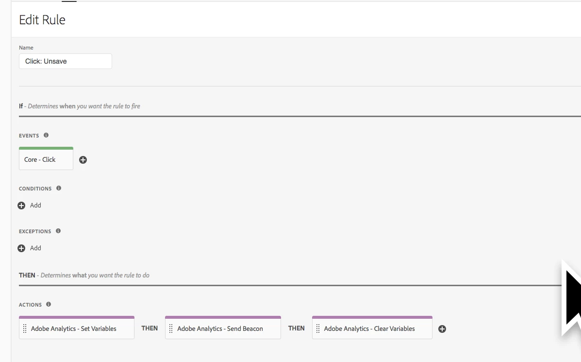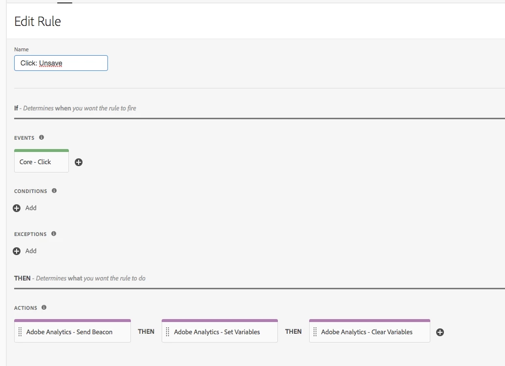 - add the "Adobe Analytics: Clear Variables" action to fire AFTER my Send Beacon (I don't know if this makes a difference to my bug)... for reference, at this point my rule looks like this: