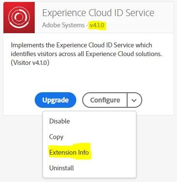When I went to the Experience Cloud ID Service extension's release notes page (linked below), it only has info for v3.1.0. When I click the "Extension Info" item in the extension's "Configure" dropdown, I get an "App not found." page within the Adobe Exchange (linked below).
