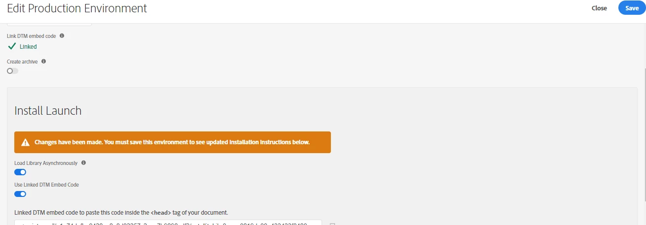 After I created the prduction environment which is linked to DTM embed code. Under Install Launch I turned on Use Linked DTM Embed Code, obviously. But it would not allow me to save the the change, then I selected crate archive and then deselected it just to have the save button to turn blue and then I clicked on Save.