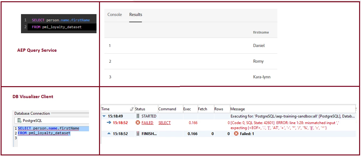 I've integrated query service with DB visualizer client and querying dataset. But it gives me syntax error.
