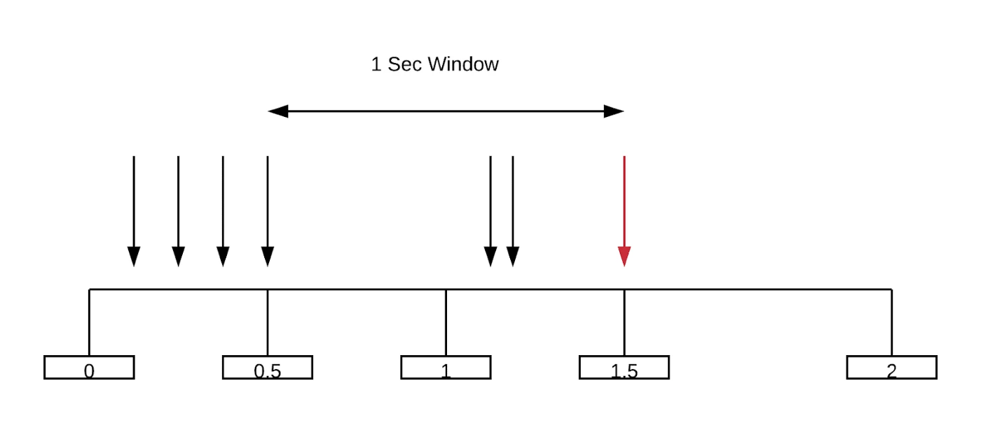 To explain a scenario, let's imagine you have a request that's coming at 1.5th second. You already had stored the number of requests from 0 to 1 second as 4 and you already counted the value from 1 to 1.5th as 2 second which is stored in the key of 1 to 2. The way the count for the time window between 0.5 seconds to 1.5 seconds is calculated for a request at 1.5th second is like below