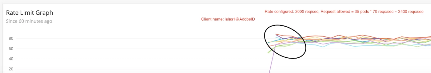 A client is configured to allow 2000 requests/sec per cluster and the cluster where we enabled the rate-limiting has 35 nodes. We found that when the rate limit is enabled, each node was allowing around 70 requests/sec totalling ~2400 requests/sec for that cluster. This results in a 20% more request that we intended for. But this is within our acceptable margin of error and the accuracy could be improved by increasing the syncing of the remote module more frequently described in the architecture.