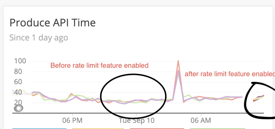 Virtually no latency impact was realized in the API calls after enabling this feature on the cluster. From the image below we can see we enabled the feature around Sept 10th,2019 at 8 am where you can see a gap of data. The latency before the feature was enabled and afterward is still around 40 ms. The spike that you see is our occasional spike which is due to heavier load and which is what we actually want to prevent through the rate limit.