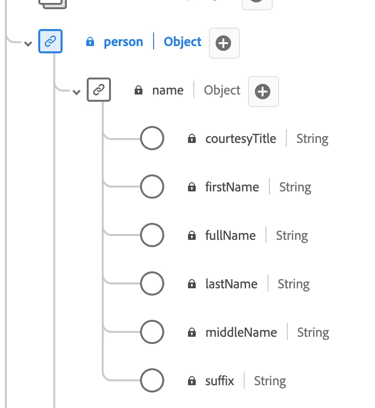 The Profile schema contains a section for person information such as first name and last name (standard Adobe XDM schemas used).