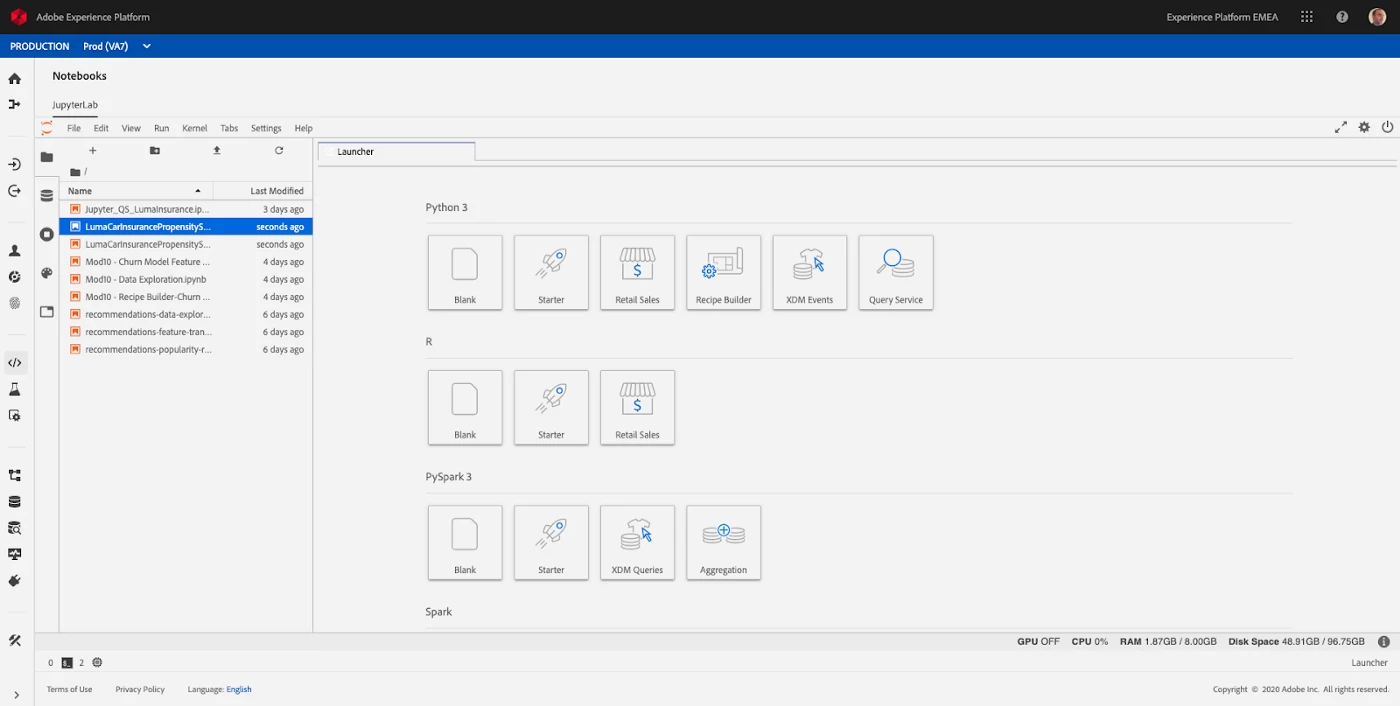 Adobe Experience Platform Data Science Workspace provides data scientists with an embedded version of Jupyter Notebooks directly inside Adobe Experience Platform and as such, they can run notebooks using Python, R, Spark, PySpark, and Scala natively on top of the Experience Data Lake of Adobe Experience Platform. We’ve built two SDKs for Data Scientists to use: