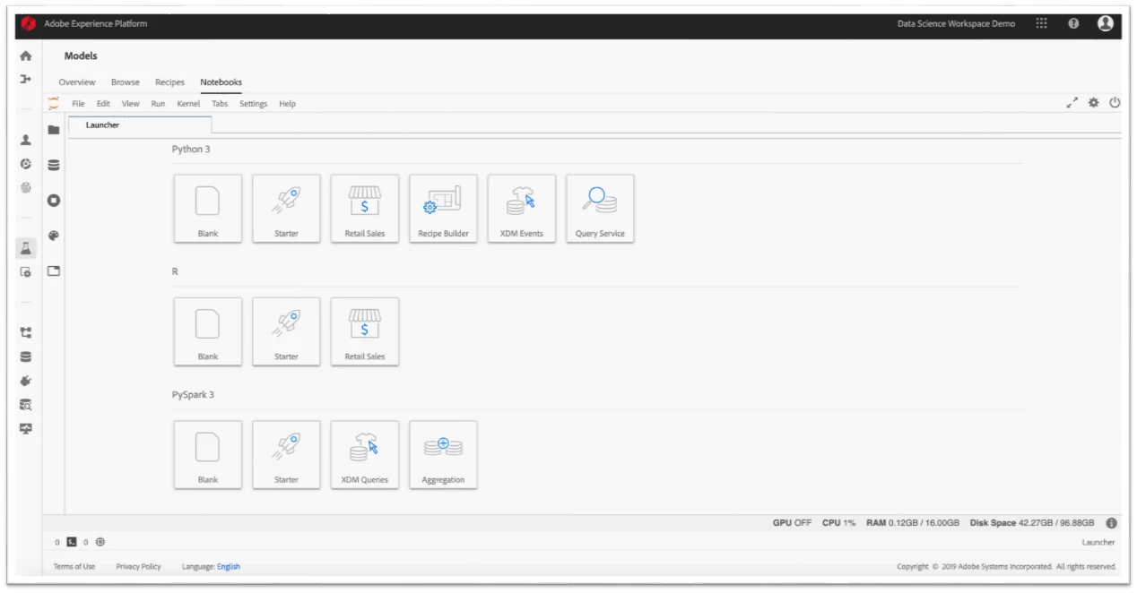 We have built a number of customized Jupyter plug-ins to extend its use within Adobe Experience Platform, some of which are server-side plug-ins working behind the scenes to make working with Jupyter Notebooks easier. For example, data scientists familiar with Jupyter's classic UI will immediately notice additional features in the Data Science Workspace such as the Launcher tab, which displays all the templates available to the user.