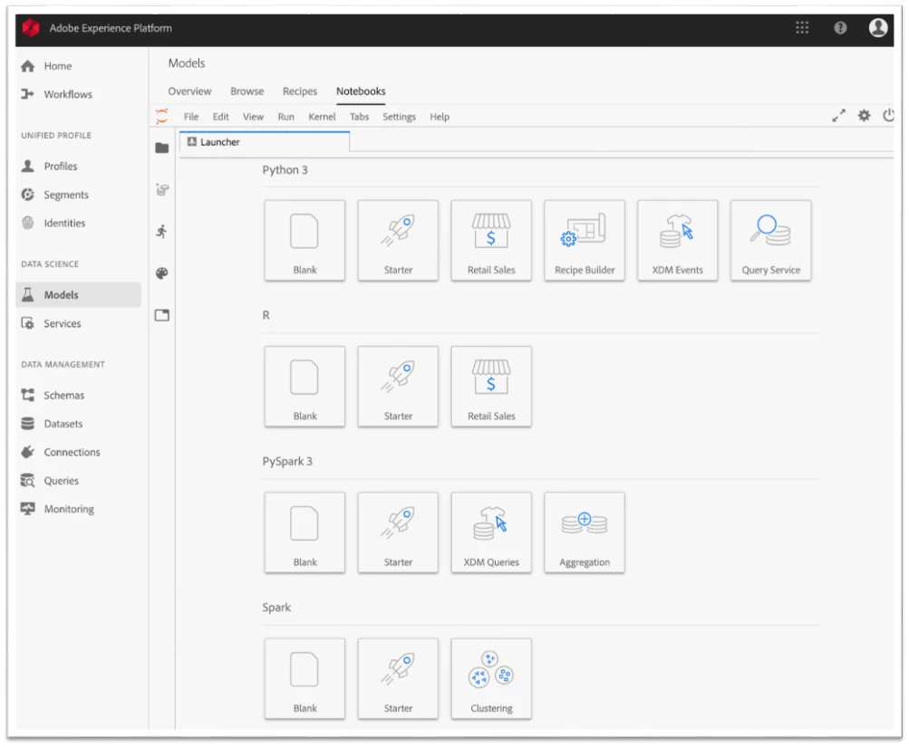 This is not the case for data scientists working in Adobe Experience Platform in which Data Science Workspace is accelerating intelligent insights with cross-channel customer data already centralized and standardized into Experience Data Model (XDM) schemas. XDM significantly simplifies data preparation. In Data Science Workspace, data scientists can choose from a number of popular languages, including Scala, Spark, PySpark, Python, R, and SQL to work with in addition to hundreds of other kernels that can be enabled. With direct integration with Jupyter Notebooks, every step in the data science workflow, including exploration, cleaning and transformation, numerical simulation, statistical modeling, model development, and visualization is much more streamlined.