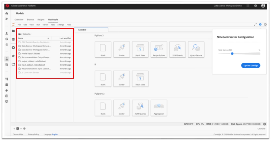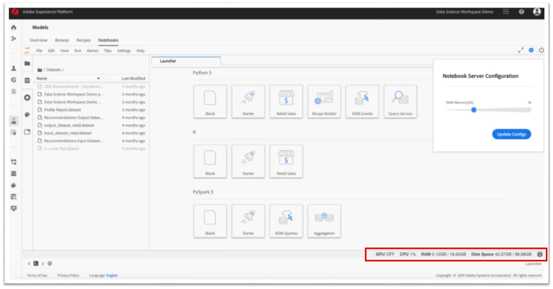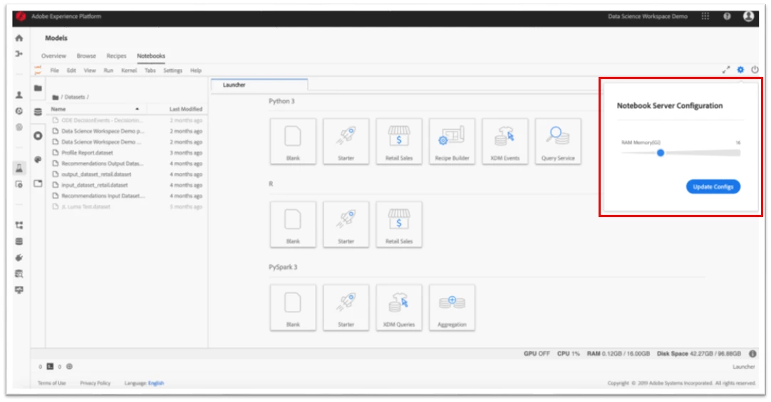 We have also developed a couple of other useful plug-ins to make working with Jupyter Notebooks within Adobe Experience Platform easier, which include a resource usage plug-in and server configuration plug-in.