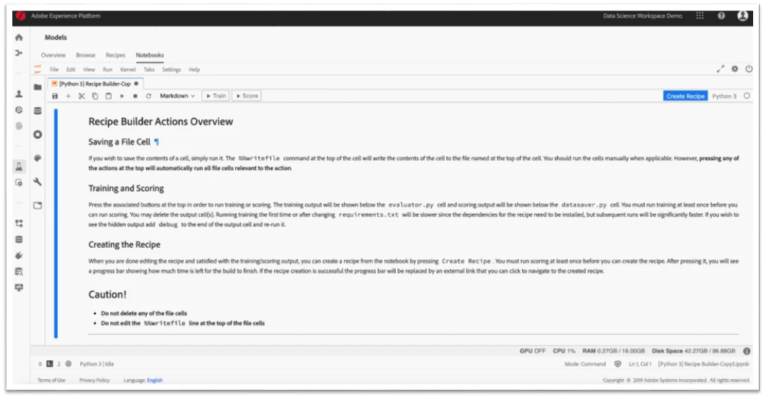 We have developed pre-built notebook templates to cover every stage in the development of a machine learning model. With Data Science Workspace, users can find very simple templates as well as templates that provide for a full-blown machine learning model covering data exploration, model building, and model training and scoring. While some data scientists have a use case that requires them to write their own code, many enjoy the advantage of having templates with much of the complexity abstracted. For these users, the ability to copy a template without having to figure out the code to access their data in Adobe Experience Platform is a key benefit because it allows them to get started more quickly.