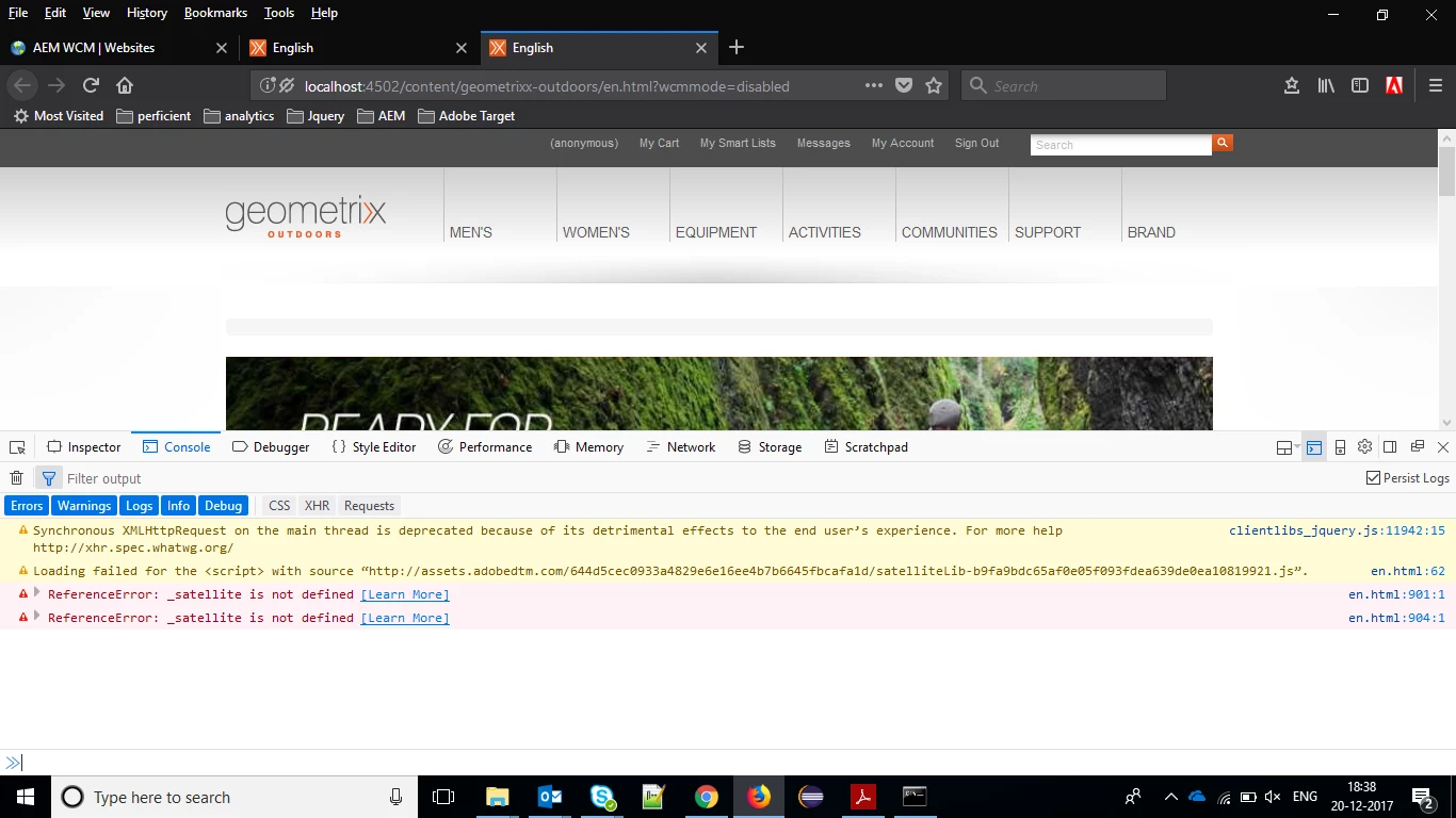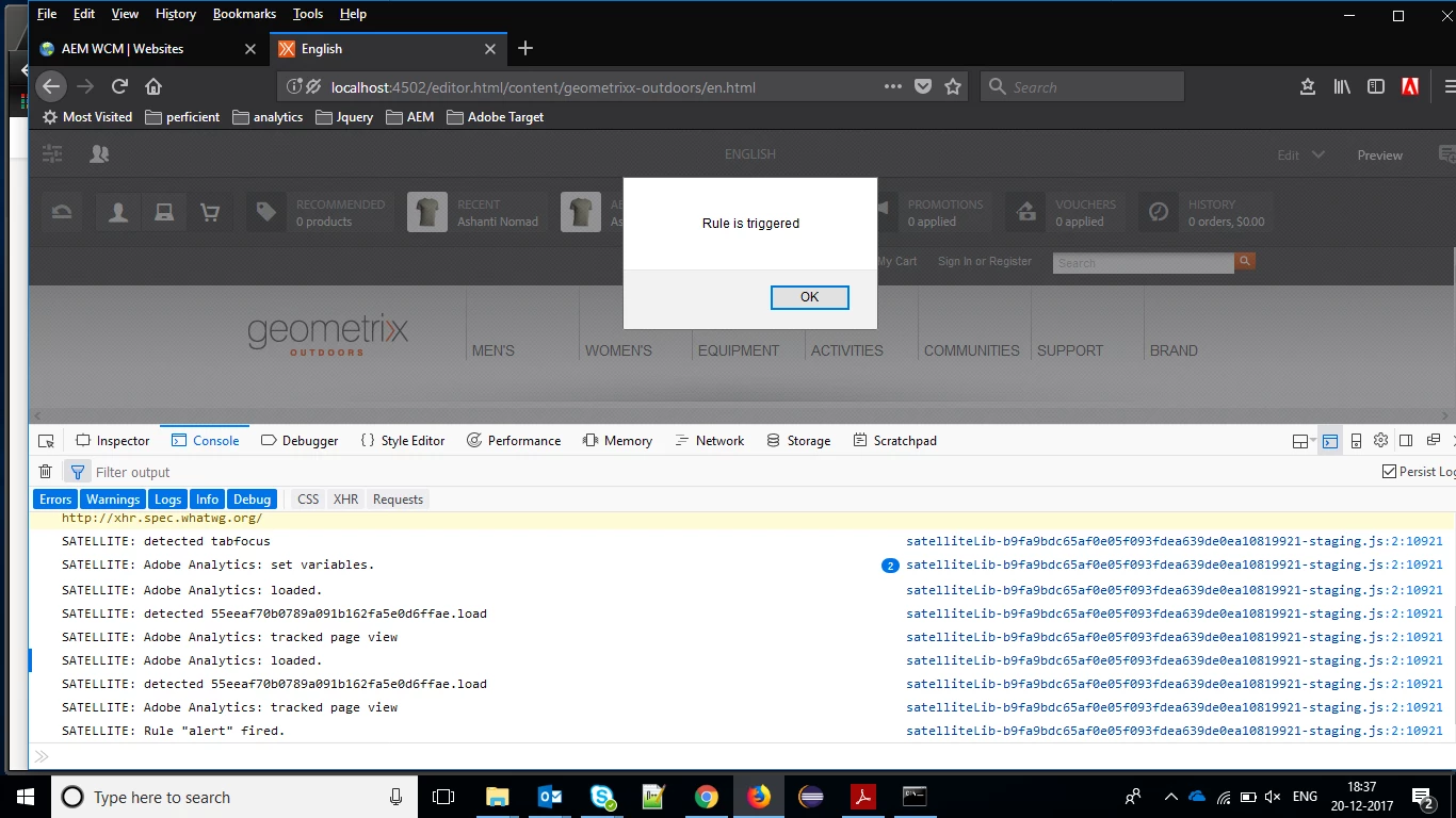 I am trying to implement Adobe analytics in AEM Geometrixx sites using DTM. I have followed all the necessary steps to implement adobe analytics in AEM Geometrixx site as referred in this link(excluding target configuration). I have done this steps before few days , at that time it was working fine. Now it shows me the error as _satallite is not defined on the applied page of Geometrixx. I had tried the staging header and footer code and still its not working so I have tried production header and footer code as recommended to be placed in head and body of page .