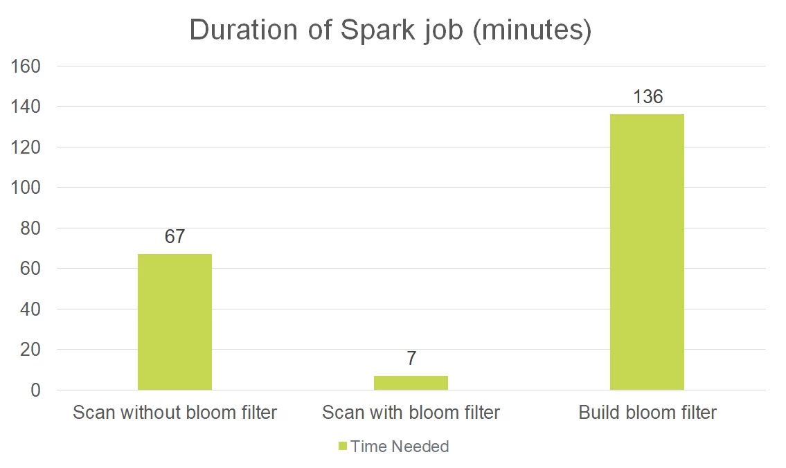 For this initial test, we ran the Spark job for the 1 TB dataset without a bloom filter, then ran it a second time with a bloom filter. As shown in the graph below, we found that without a bloom filter the scan required 67 minutes to complete. In contrast, with a bloom filter, the second scan only lasted 7 minutes — cutting the Spark job’s runtime by 89%.