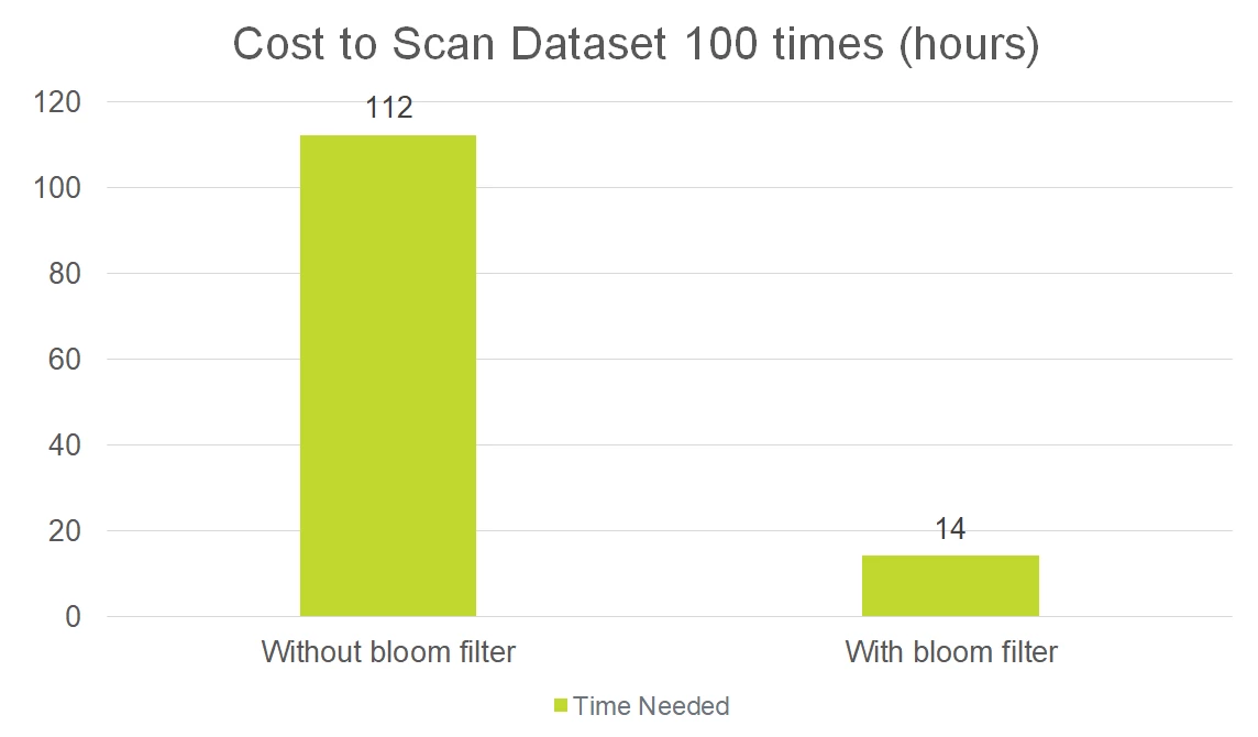 The graph above also shows that an extra computing cost is introduced when building a bloom filter from a raw dataset. This cost, however, can be amortized across multiple scans since a single bloom filter can be used multiple times.