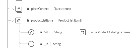 Luma Web Events Schema has a SKU under "productListItems" which refers to the SKU (primary identity) field of "Luma Product Catalog Schema".