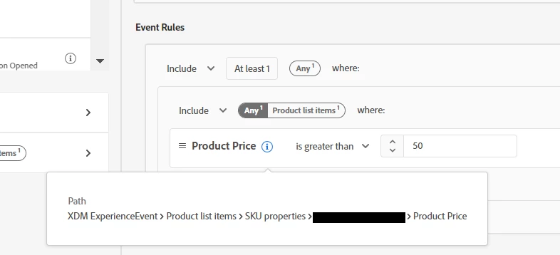 As part of a POC using Lookup entities, I am trying to build a segment of audiences who are viewing any product which is priced more than $50. I have been using the below schemas: