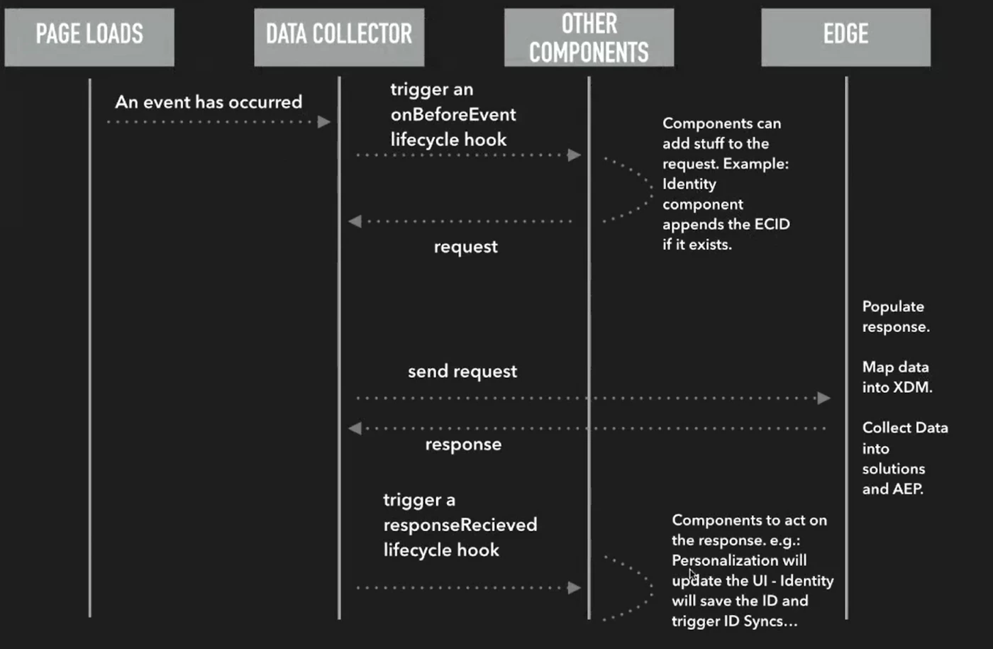 - The data collector sends the request to a single endpoint, enabling multiple actions (e.g. populate a response with personalized information) and also collect data for Adobe Experience Cloud solutions and Adobe Experience Platform.