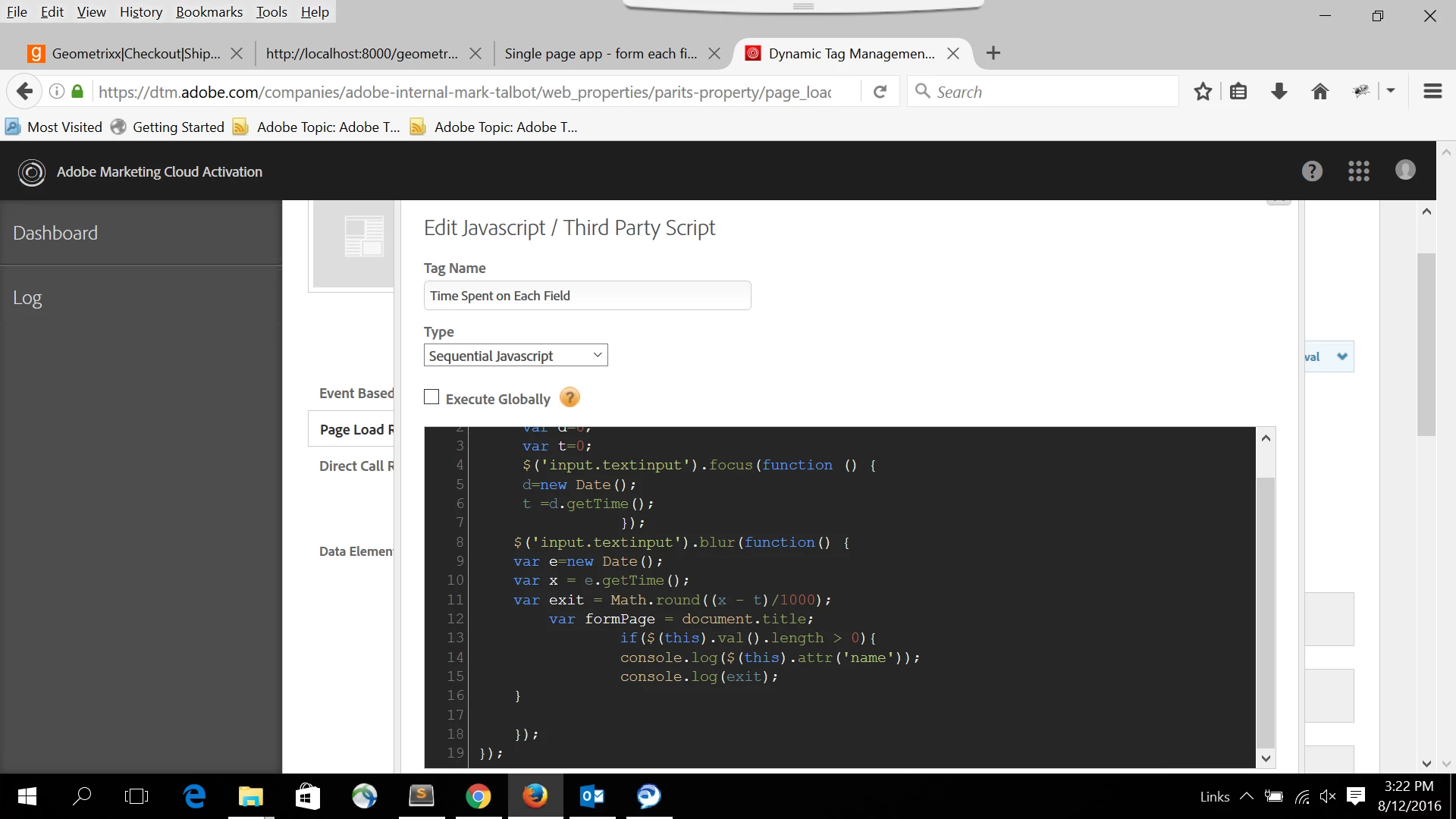 update: the below code seems to be working by getting the name of the field and field timing on the browser console. But, it doesnt seem to be working when i include this code in DTM. I could understand sine the page is not reloading and that's the reason it is not working. Any help would be greatly appreciated