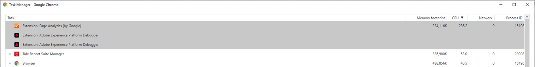 I keep noticing that after having the Chrome extension enabled, and opening and closing enough tabs, eventually all the cores of my CPU spike to 100% and RAM usage goes through the roof. When I pop open Chrome’s Task Manager specifically, I can see that the extension is using 200%+ of the CPU (guess that means multiple cores?). Simply disabling the extension and then re-enabling it drops CPU usage down to single digits and restores RAM usage to a sensible level. (Side note: you can ignore the “Extension: Page Analytics (by Google)” part in the example screenshot below; I’ve also seen the “Adobe Experience Platform Debugger” with “LastPass: Free Password Manager”. It seems like the common Task with the spike is the AEPD extension)