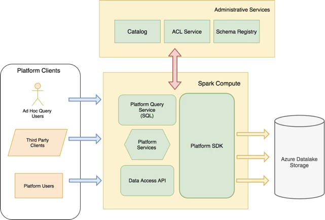 Additionally, our users run thousands of queries on tens of thousands of datasets using SQL, REST APIs and Apache Spark code in Java, Scala, Python and R. The illustration below represents how most clients access data from our data lake using Spark compute.
