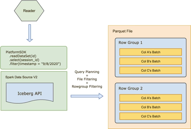 Underneath the SDK is the Iceberg Data Source that translates the API into Iceberg operations. This allowed us to switch between data formats (Parquet or Iceberg) with minimal impact to clients. The picture below illustrates readers accessing Iceberg data format. Query planning and filtering are pushed down by Platform SDK down to Iceberg via Spark Data Source API, Iceberg then uses Parquet file format statistics to skip files and Parquet row-groups.