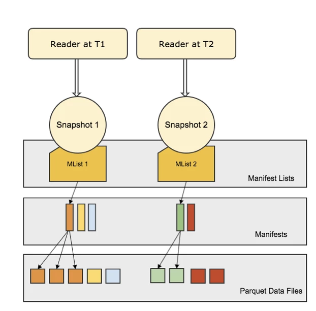 Iceberg API controls all read/write to the system hence ensuring all data is fully consistent with the metadata. Reads are consistent, two readers at time t1 and t2 view the data as of those respective times. Between times t1 and t2 the state of the dataset could have mutated and even if the reader at time t1 is still reading, it is not affected by the mutations between t1 and t2.