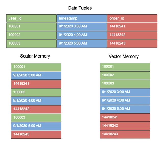 Vectorization is the method or process of organizing data in memory in chunks (vector) and operating on blocks of values at a time. Figure 5 is an illustration of how a typical set of data tuples would look like in memory with scalar vs. vector memory alignment.