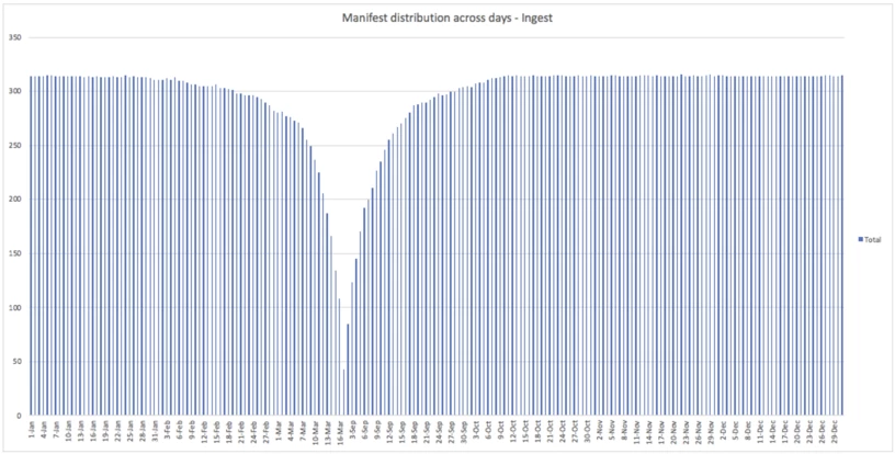Iceberg allows rewriting manifests and committing it to the table as any other data commit. We rewrote the manifests by shuffling them across manifests based on a target manifest size. Here is a plot of one such rewrite with the same target manifest size of 8MB. Notice that any day partition spans a maximum of 4 manifests. Additionally, when rewriting we sort the partition entries in the manifests which co-locates the metadata in the manifests, this allows Iceberg to quickly identify which manifests have the metadata for a query. Iceberg supports rewriting manifests using the Iceberg Table API. This tool is based on Iceberg’s Rewrite Manifest Spark Action which is based on the Actions API meant for large metadata. The chart below is the manifest distribution after the tool is run.