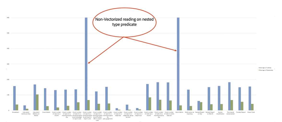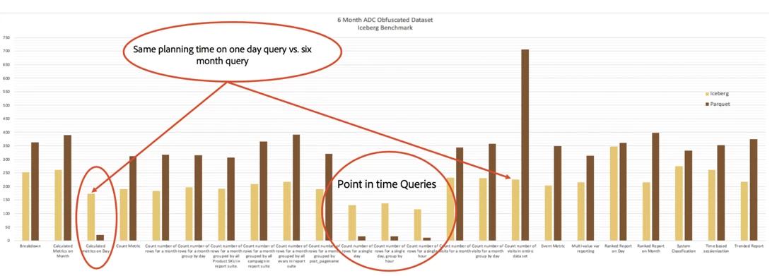 - Queries over Iceberg were 10x slower in the worst case and 4x slower on average than queries over Parquet.