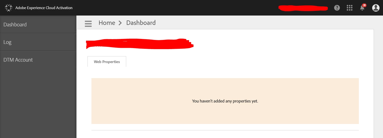 I'm having a similar issue to (Unable to create web properties ) on the latest version of DTM/Admin Console. I'm set up as an Admin for DTM in the Admin Console, however I'm not able to configure anything within DTM itself. See below a screenshot of DTM, where nothing can be configured: