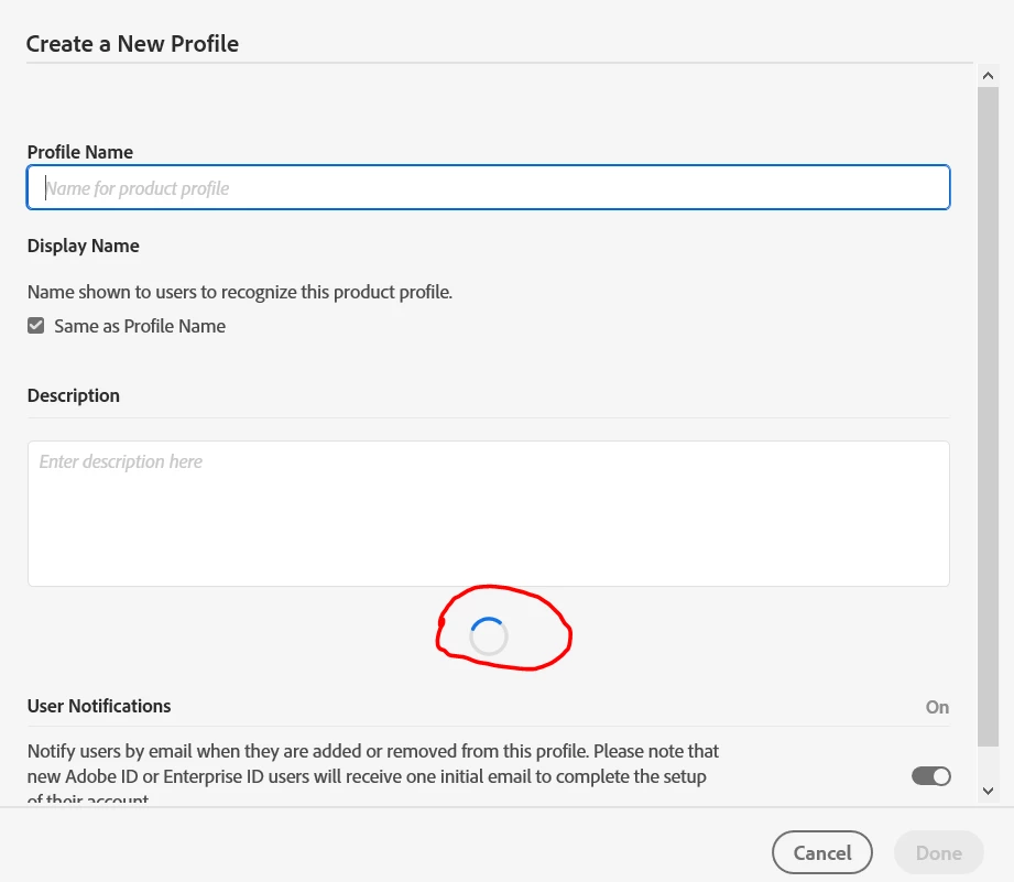 Trying to 'Create New profile' highlights this problem further: below is a screenshot of the 'new profile' screen, which shows the loading spinner where the 'Permission Groups' drop down should exist. However, the spinner disappears and there's no option to select any of the permission group profiles.