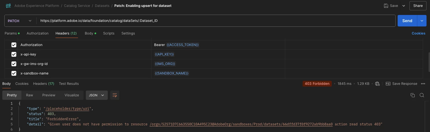I am using API to enable upsert for a dataset and I have received a 403 error: Given user does not have permission to resource {{dataset path}} action read status 403. I have double checked that I have enabled all access to the role and that my API credential is included for that specific role.