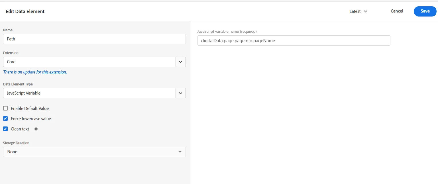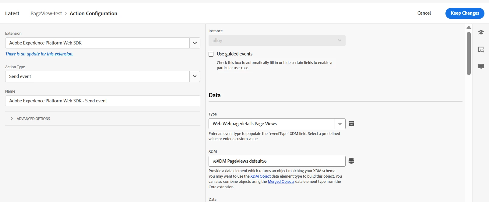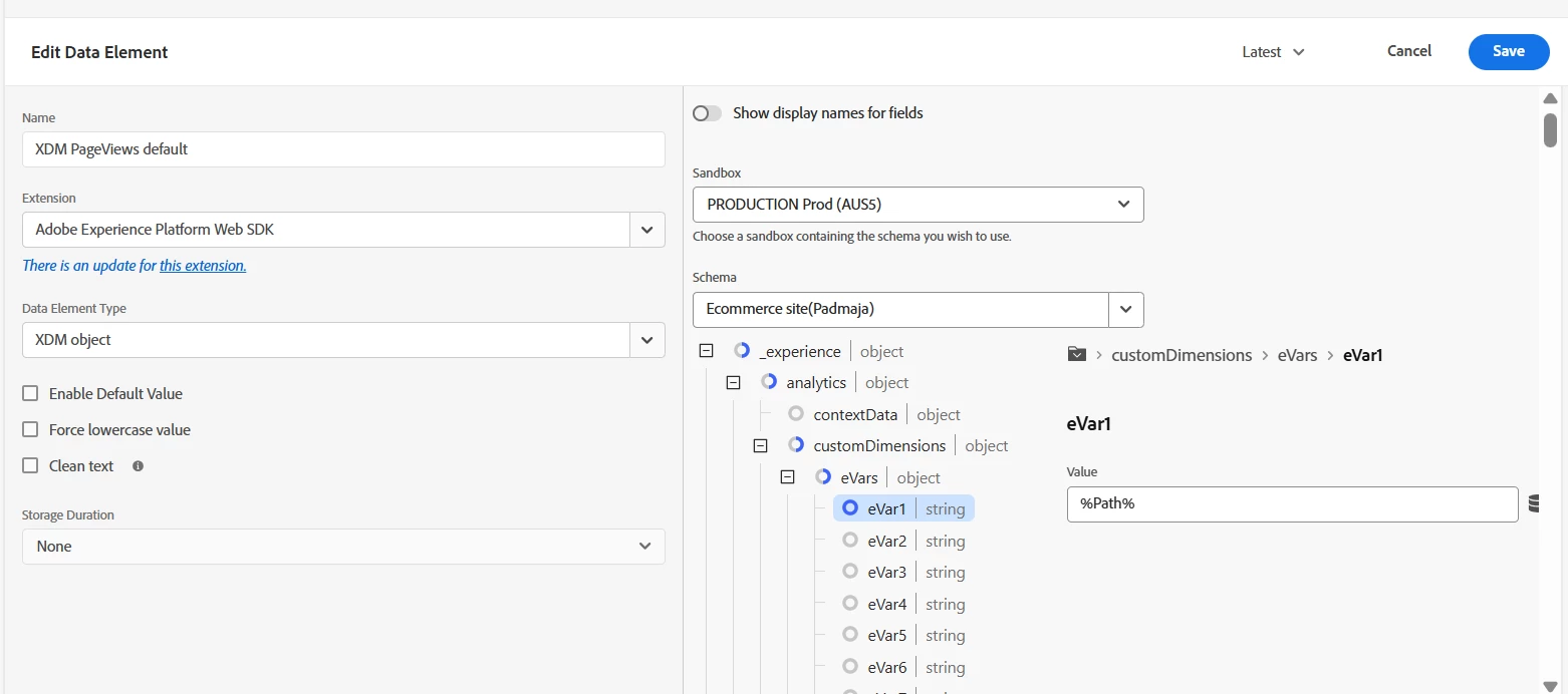2. This is the XDM object for the default page view. Here I gave the evar for the Path and web page details for the default page view.