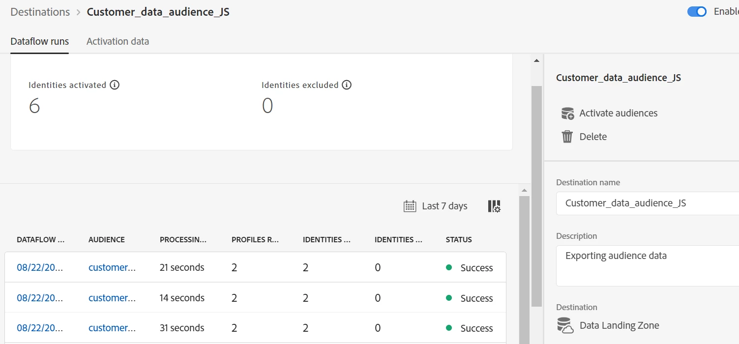 I created a destination scheduling an audience export after every segment evaluation. When I check the dataflow, it shows successful run and the folder path is given correctly,compression type as none,file format as json but still I'm unable to see the data in my folder in data landing zone.