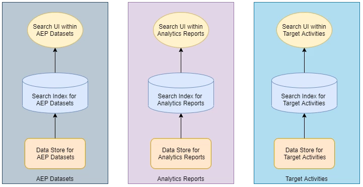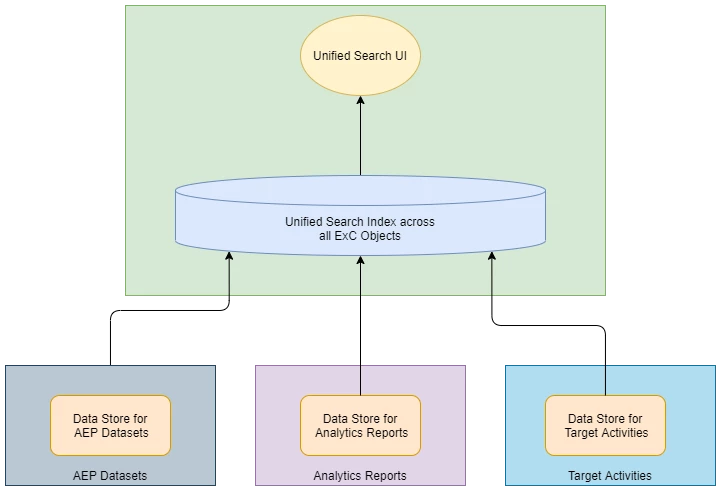 Adobe Experience Cloud, comprising a number of diverse products and capabilities, like Adobe Experience Platform, Adobe Analytics, Adobe Target, and others, faced a similar problem. Each of these products exposed it’s own Search Bar and User Interface with its own search capabilities. This resulted in an inconsistent search experience as the user navigates across the offered capabilities. And each capability exposed search confined over it’s own business entities. What we needed was a unified search experience where a user could search for data that is persisted across data stores, and find the matching results appropriately ranked by relevance, from across any of these products in a single search operation.