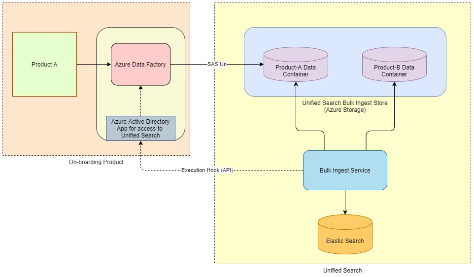 Data stores from different products use an ETL Tool (example: Azure Data Factory) to export a snapshot of its data into Unified Search Azure Storage Containers, and exposes an Export API which could be triggered by Unified Search system on demand. Using Azure Data Factory Pipeline to trigger such an export it’s easy to set up Azure Active Directory Application and Service Principal to grant Unified Search access to trigger such an export operation using Azure Data Factory Pipeline API. On the other hand, Azure SAS URI, passed from Unified Search to the product system in the Export API call, helps restrict the write access to dedicated Storage Containers assigned for the Product, and for a limited time period when the Bulk Ingest Workflow is run. Once the Data Snapshot is dumped into the Unified Search Storage, a Bulk Ingest Service reads the same for ingestion into Elasticsearch.