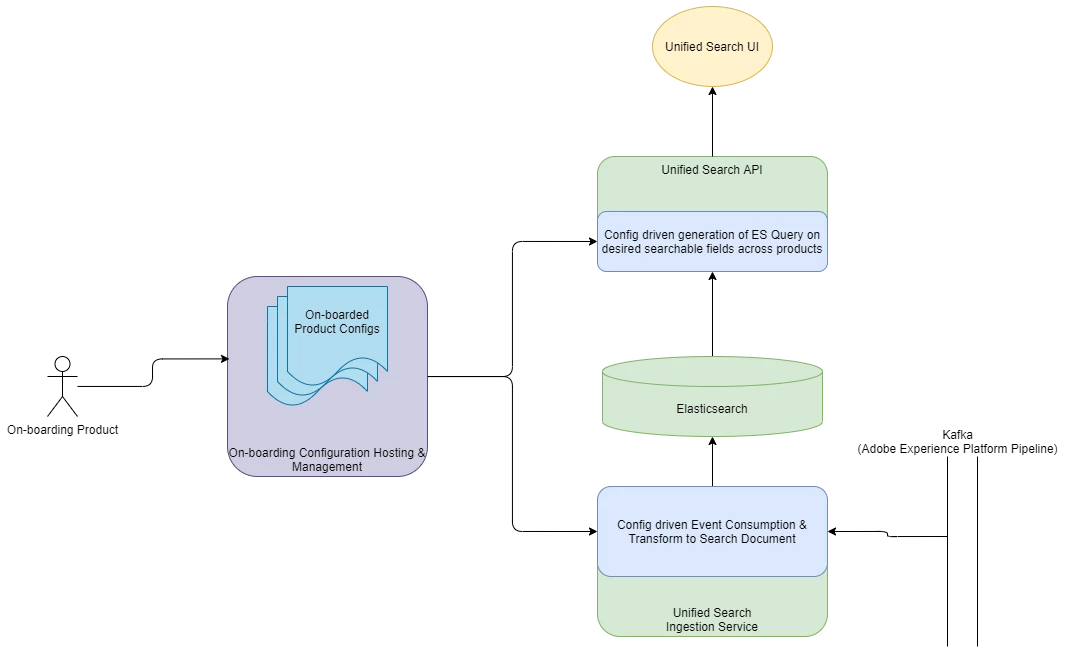 The Unified Search system, including the Ingestion and the Search API Workflows, uses such configs in runtime, such that any new product onboarding or config updates are reflected in the Unified Search system, in runtime, without manual intervention or development effort.