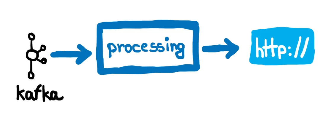 To illustrate our process when building an application using Akka Streams, we will use a simplified architecture of a Real-time Customer Data Platform application as an example. The figure below shows said application, which continuously fetches profile updates from an Apache Kafka topic and dispatches them as HTTP requests to an endpoint.