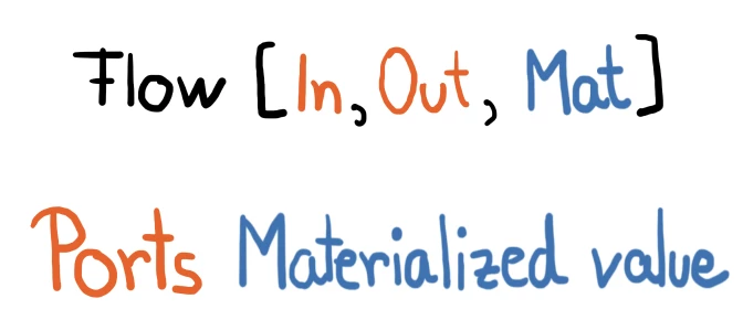 In addition to sketching the pipeline, we can also start planning the domain model. The flow stage, for instance, has two interconnecting ports, which are described through the types: In, Out. The third type, Mat, is called the materialized value type.