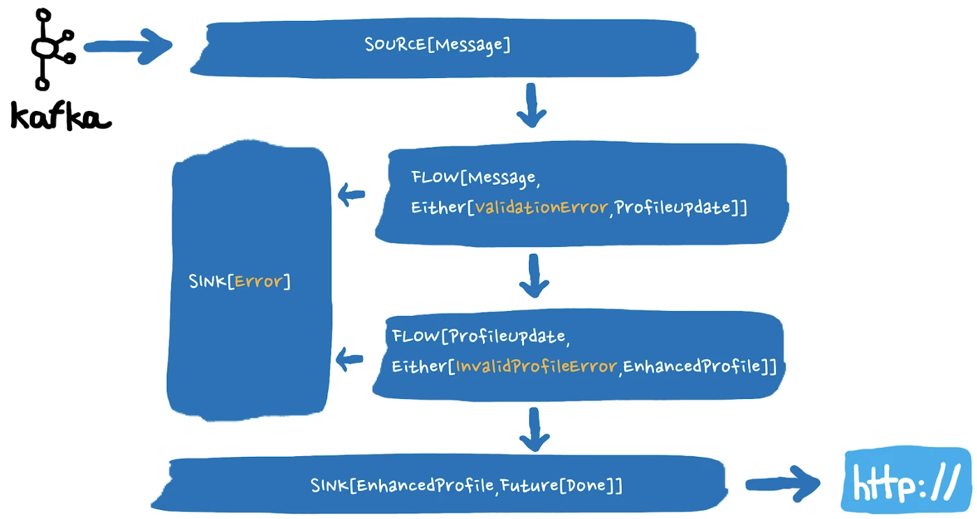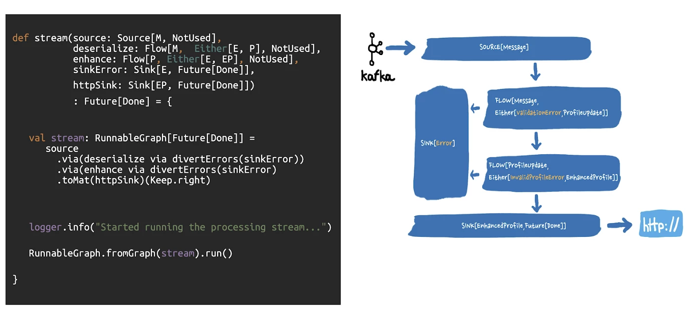 For this, we use Scala Either — a dual-type that can wrap a result or a failure. With Scala Either, we can easily transform business logic failures from a Profile Update event to an Either[ValidationError, ProfileUpdate], which is also an event. This is then processed downstream by specialized stages without impacting the entire data flow.