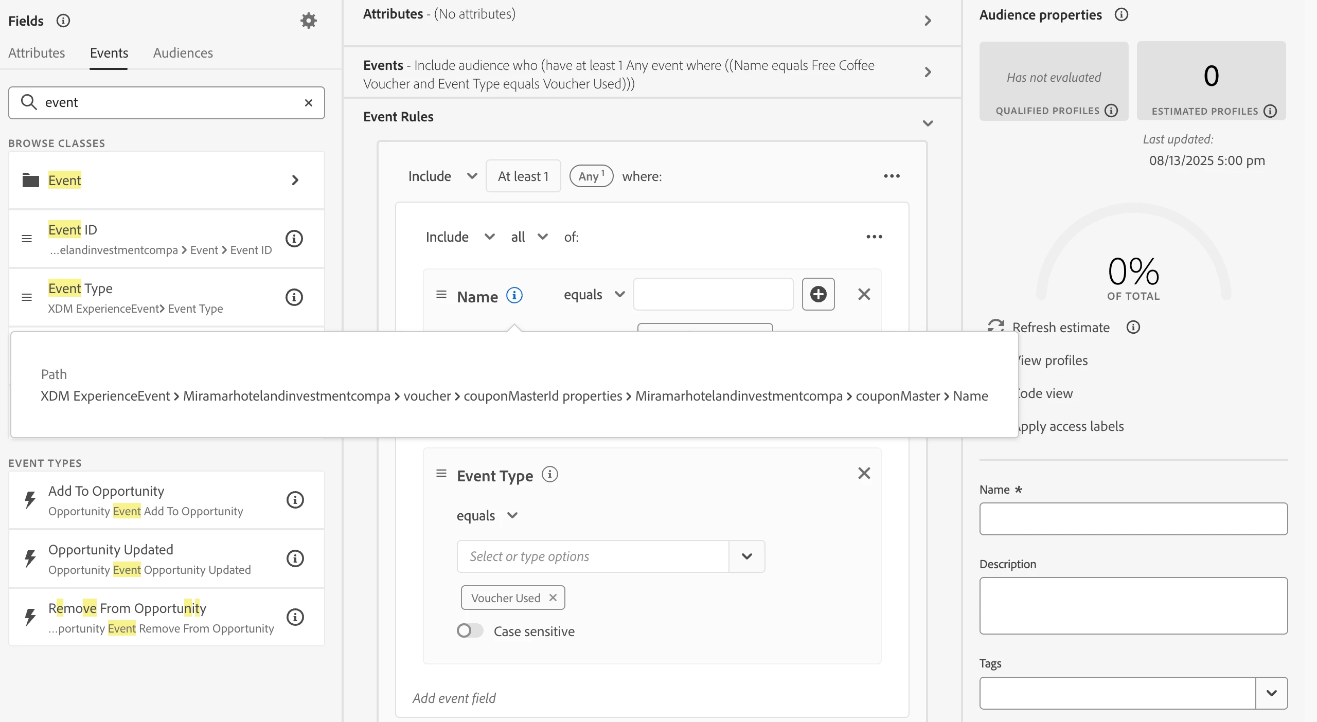 Result: 0 profiles returned. - Segmentation Rule: Event Type = "Voucher Used" AND Coupon Master Id = "RM001"