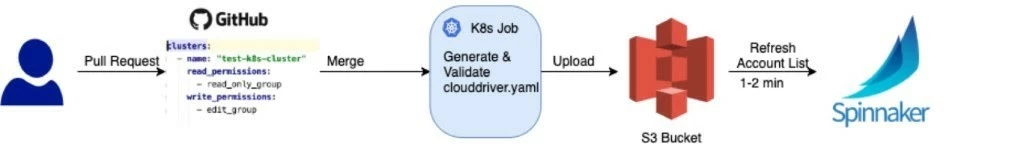 Once the PR is merged, a Kubernetes job starts which validate the data and generates the Clouddriver config file for the new account. The file is then pushed to S3 bucket where all account details are stored. The kubeconfig files are stored in the same bucket but in a different path. Finally, the clouddriver-local.yaml file is generated which contains the newly added account. Spinnaker periodically scans the S3 bucket for this file and if a new version is detected, a Clouddriver account refresh is performed. Within 2 minutes after the PR is merged, the new account will appear in the Spinnaker UI. Below is the simplified diagram of the dynamic account onboard process: