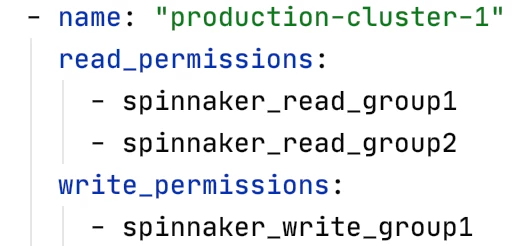 At the Spinnaker account level: Teams will have LDAP permissions set for each account. If you are familiar with the Clouddriver config file structure, then the following image will look familiar: