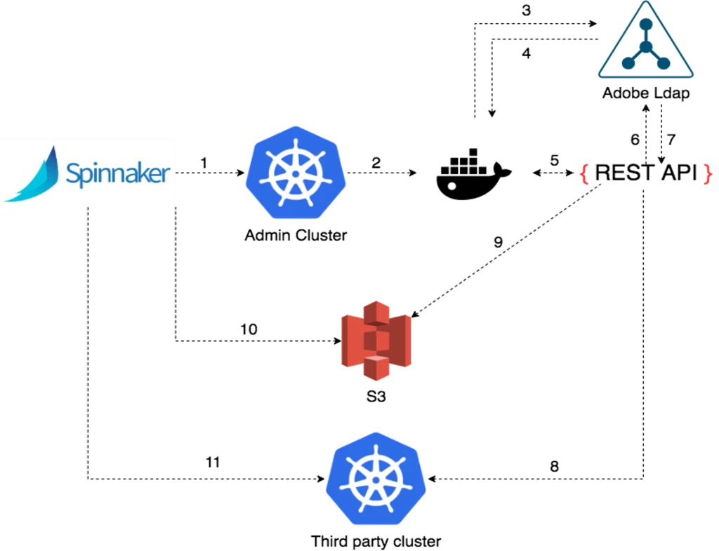 - Once the necessary service account was configured, the kubeconfig file had to be generated. The file and the cluster details were then sent securely to a Spinnaker admin.