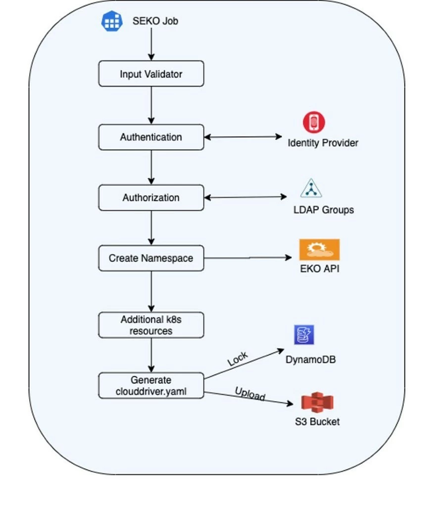 SEKO will act as a liaison between multiple entities which are part of this process. Going further into the details on how it works, SEKO allows us to parallelize stages (running multiple in parallel) since we want those to be used in multiple pipelines across multiple Spinnaker applications. This also means that in case two pipelines want to modify the account list at the same time their changes are not overridden. Therefore, we’ve added a locking mechanism using DynamoDB which creates a queuing process while S3 file uploads are performed. The internals of our app is shown in the following diagram:
