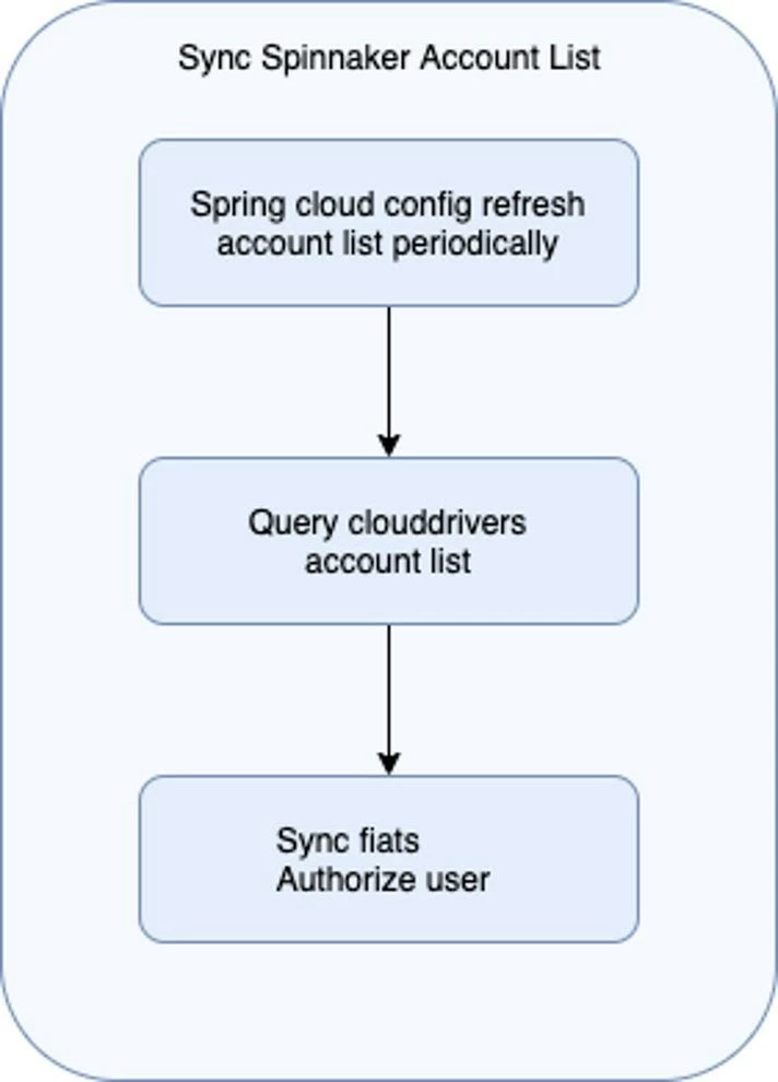 Spring cloud configuration will periodically refresh the account list by scanning the S3 bucket. Clouddriver microservices will then be synchronized to include the newly created/removed account. Finally, the Fiat microservice will perform a user authorization process across accounts. This internal mechanism is exemplified in the following image: