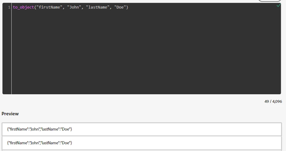 Eg: to_object(“firstName”, “John”, “lastName”, “Doe”) is not ingesting any values.