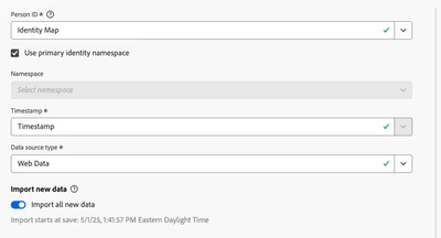 There is only one dataset in the CJA connection, which is coming from the WebSDK. It has the the connection has the identity map default settings as the person ID. I didn't mess with this at all.