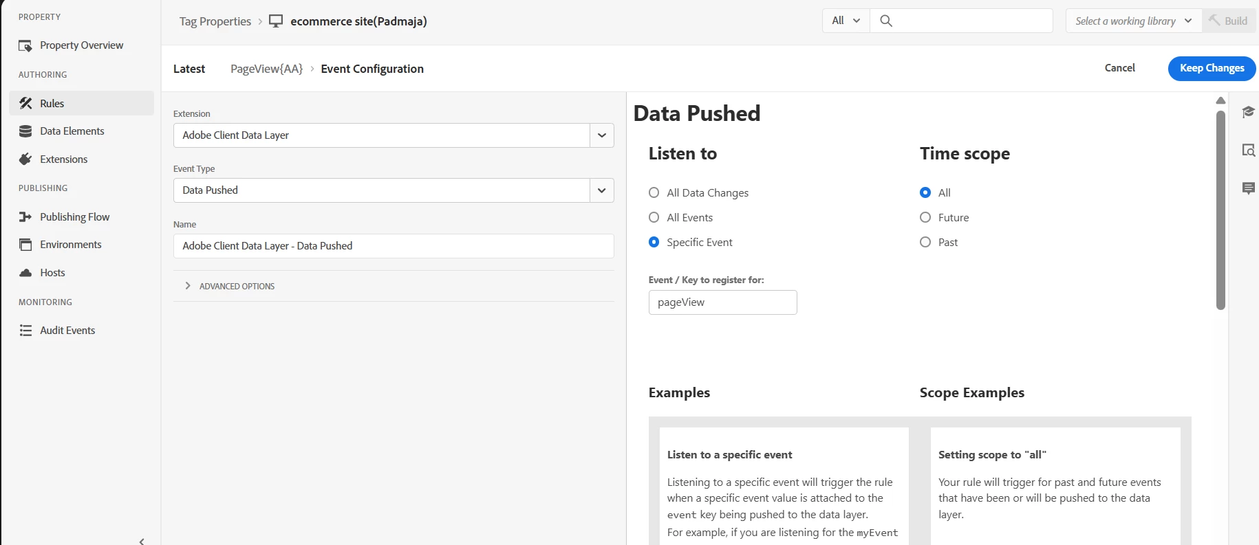I want to send data to Adobe Analytics by setting a new Web SDK property. I have the Adobe Client Data Layer implemented on all pages of the domain I want to track. I have installed the Adobe Client Data Layer extension on Data Collection so I can use the data layer values to set the different rules.