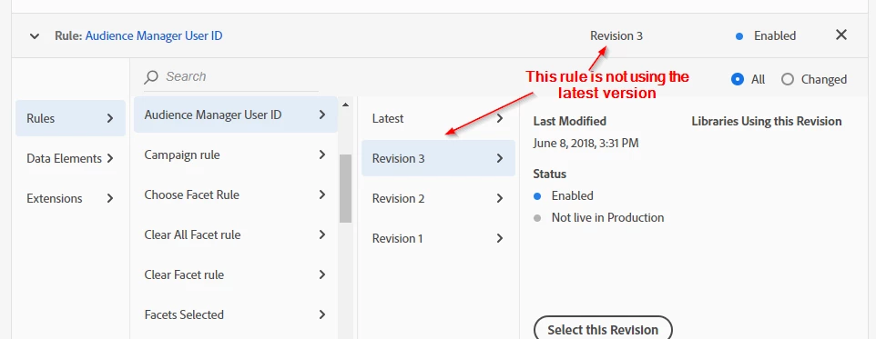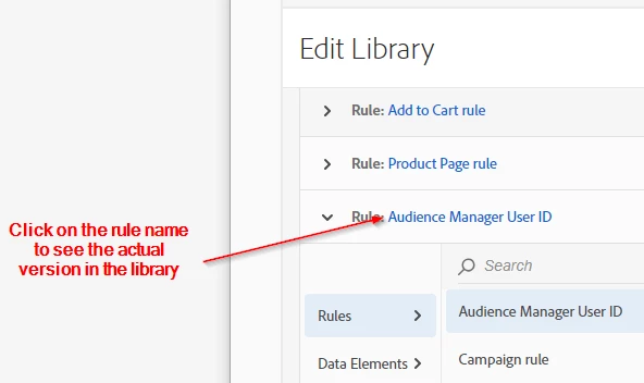 If you go to the publishing tab inside Launch and open up your library, is the published version of the rule the latest version? You can actually click on the rule's name inside the library and see the actual version that's being published by that library and see if it matches what you expect to be seeing.